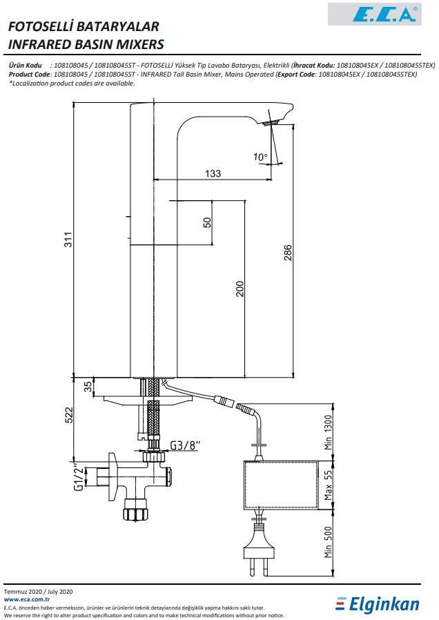 Çift su girişlidir Çıkış ucu uzunluğu 133 mm’dir Çıkış ucu yüksekliği 286 mm’dir 220 V güç kaynağı ile çalışır Filtreli ara musluklar ürünle birlikte verilmektedir Kireç temizleme sistemli perlatör 3 bar basınçta su akış miktarı dakikada 5 lt Yurtiçi ücretsiz montaj hizmeti verilmektedir