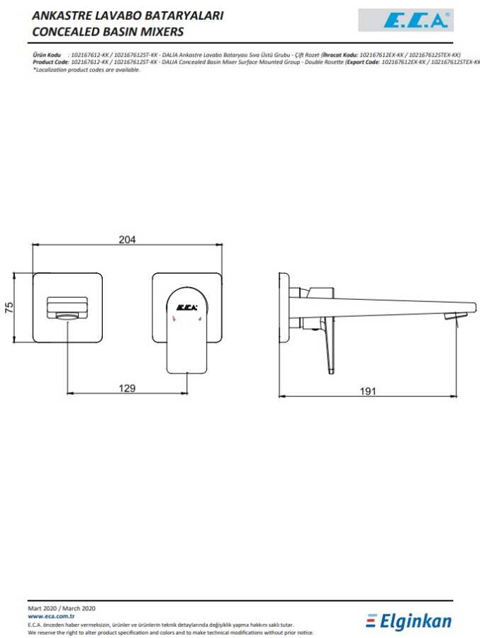 Farklı rozet alternatifleri mevcuttur Çıkış ucu uzunluğu 191 mm’dir 3 bar basınçta su akış miktarı dakikada maksimum 7,5 lt 102166601 kodlu sıva altı grubu ayrıca alınmalıdır