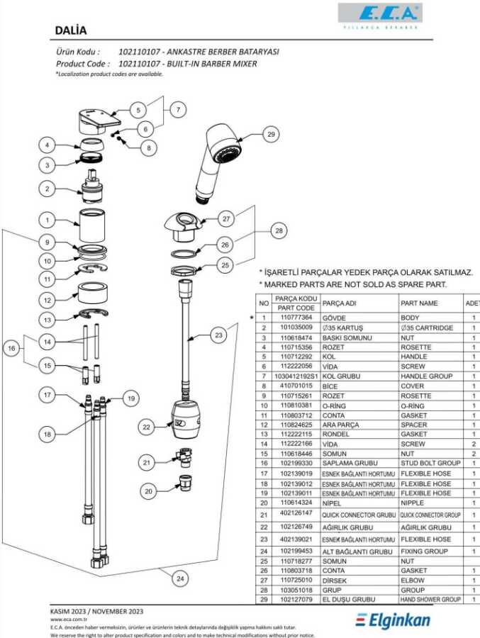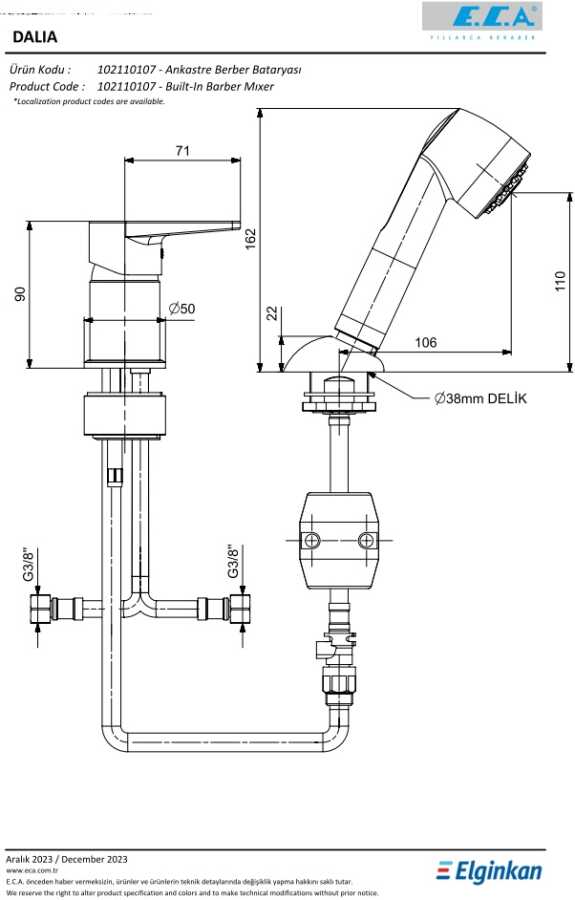 Çıkış ucu uzunluğu 110 mm’dir Çıkış ucu yüksekliği 106 mm’dir Kireç kırıcılı özel yıkama ünitesi Burkulmaz somunlu krom kaplı pirinç spiral 1,5 m 3 bar basınçta su akış miktarı dakikada maksimum 7,7 lt 2 fonksiyonlu el duşu