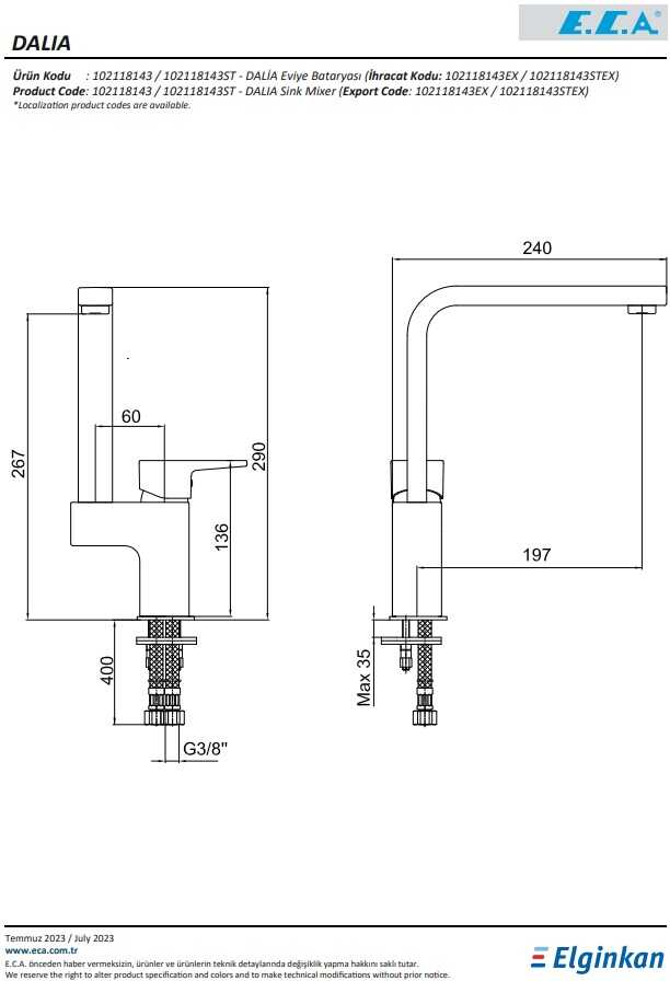 Çıkış ucu yüksekliği 267 mm’dir