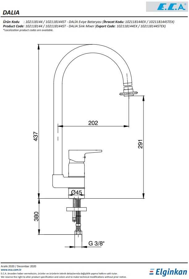 Çıkış ucu uzunluğu 202 mm’dir Çıkış ucu yüksekliği 291 mm’dir Akış yönü değiştirilebilir, el yakmayan, mafsallı perlatör grubu 360° döner çıkış uçlu 3 bar basınçta su akış miktarı dakikada maksimum 7,2 lt