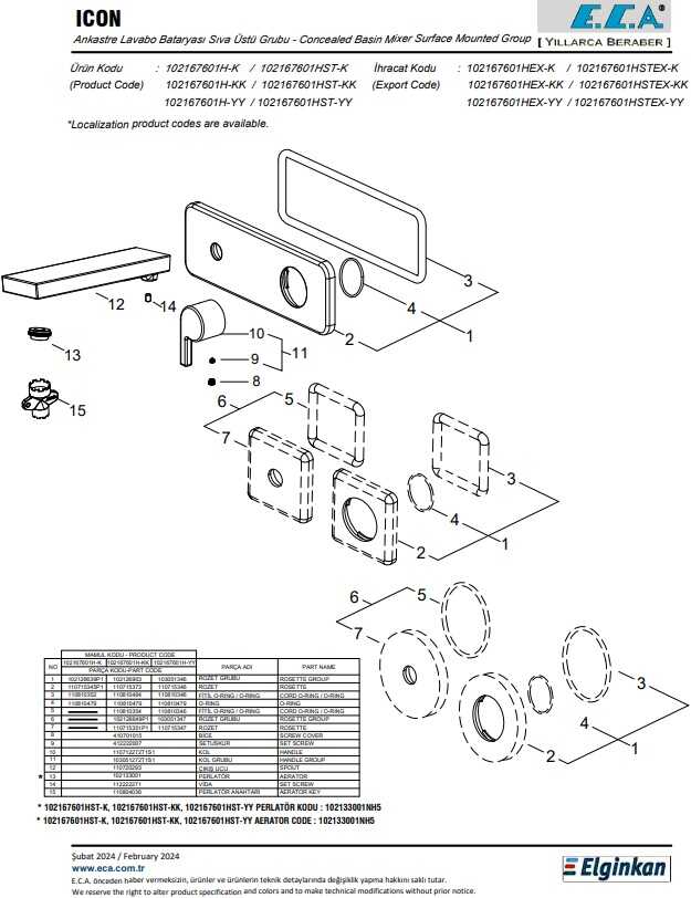 İnovatif E.C.A. Hygiene Plus kaplama Kireç kırıcılı gizli perlatöre sahiptir Farklı rozet alternatifleri mevcuttur Çıkış ucu uzunluğu 190 mm’dir 3 bar basınçta su akış miktarı dakikada maksimum 6,9 lt 102166601 kodlu sıva altı grubu ayrıca alınmalıdır.