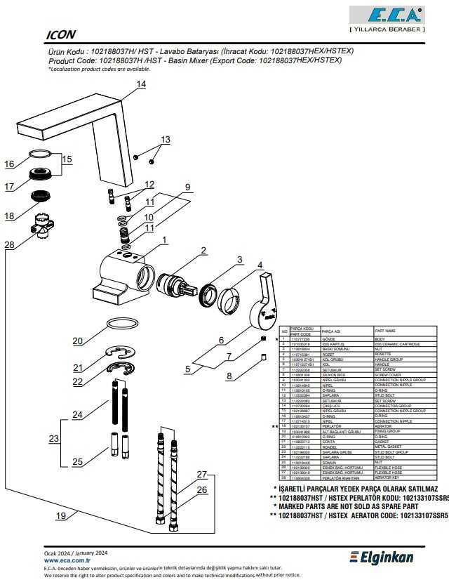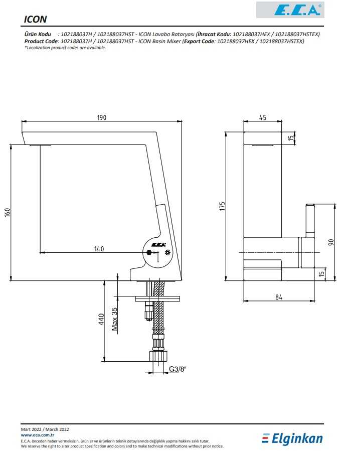 Çıkış ucu uzunluğu 140 mm'dir. Çıkış ucu yüksekliği 160 mm'dir. Kireç kırıcılı gizli perlatör. 3 bar basınçta su akış miktarı dakikada maksimum 5,7 lt. İnovatif E.C.A. Hygiene Plus kaplama.
