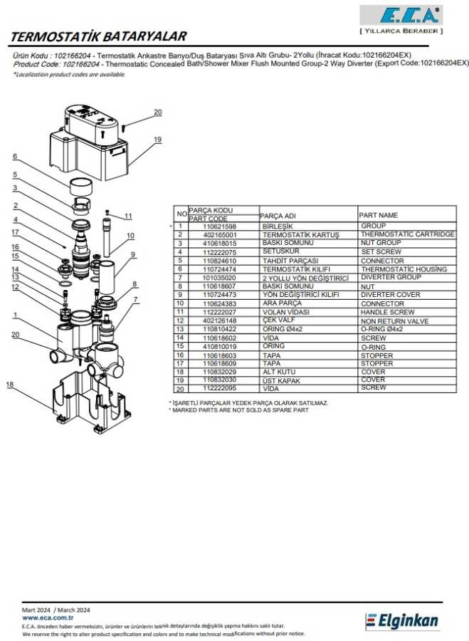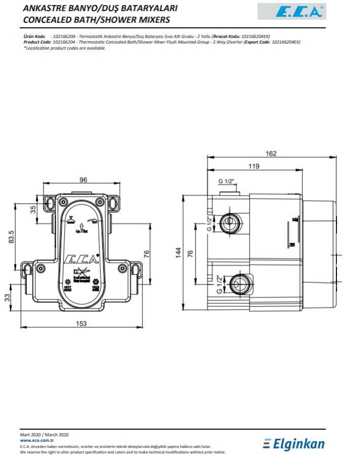 Eca Krom Termostatik Ankastre Banyo/Duş Batarya 2 Yollu Sıva Altı