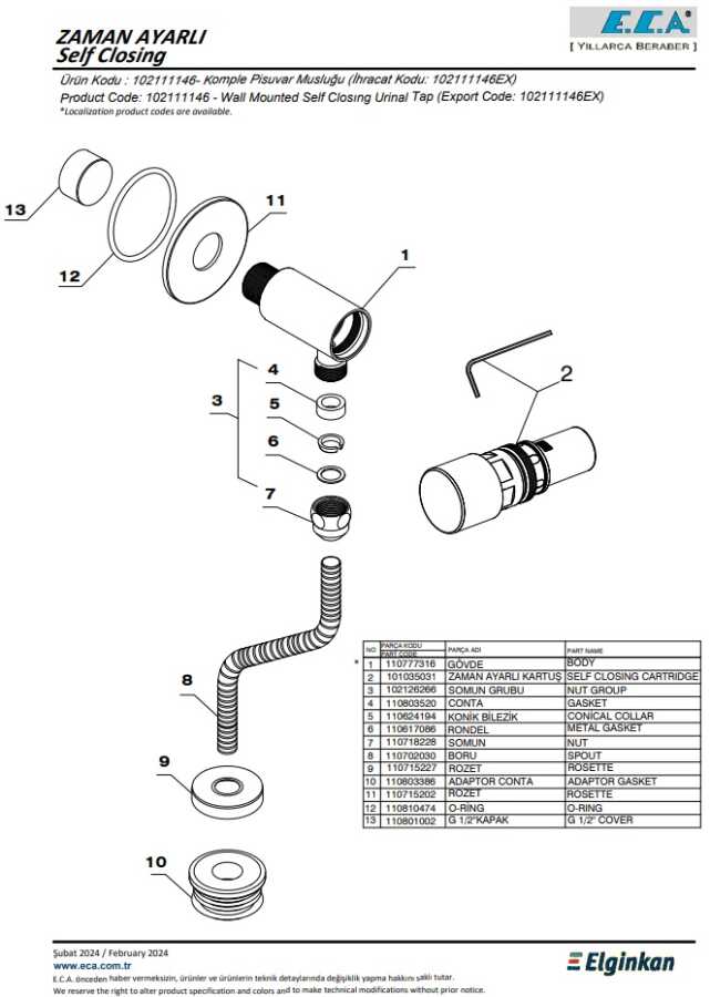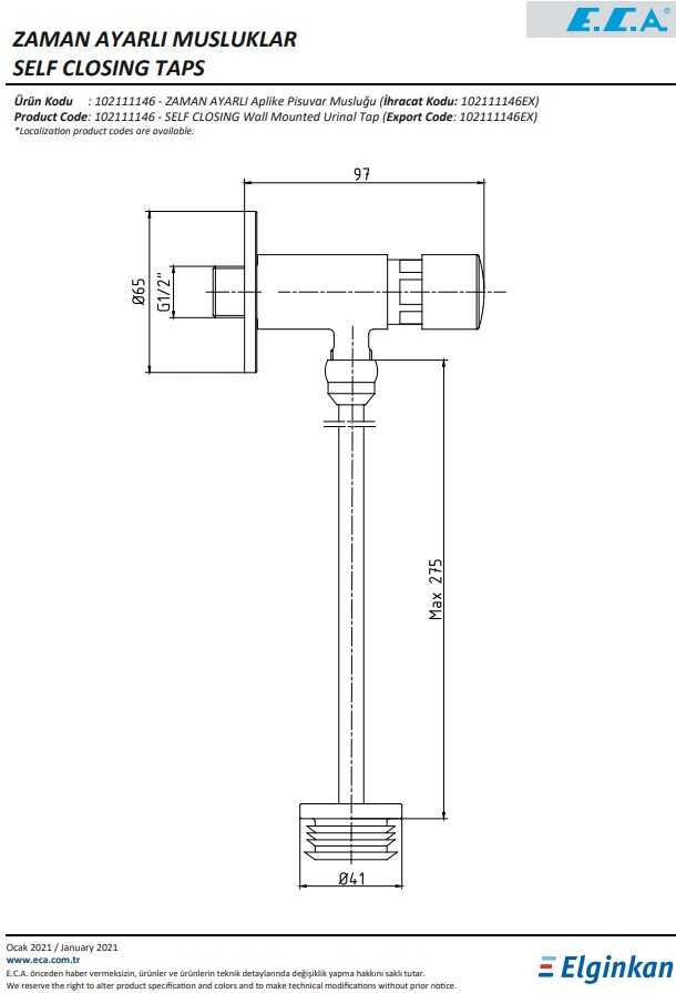 Eca Krom Zaman Ayarlı Aplike Pisuvar Musluğu 102111146 Tek Su Gir