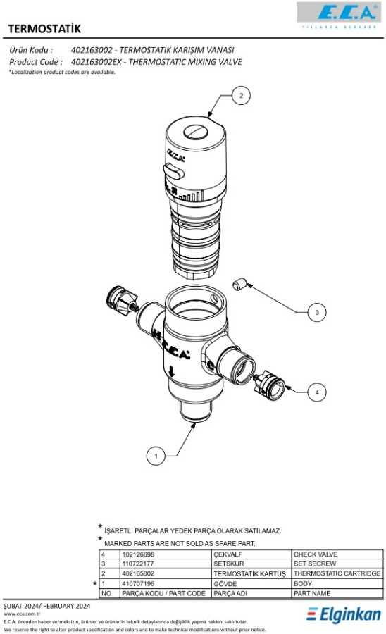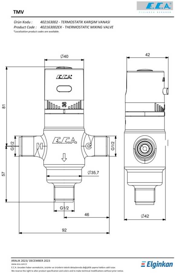 Fabrika çıkış ayarı 38ºC ‘dir 38°C serbest akıştaki en fazla su akış miktarı dakikada maksimum 40 lt ‘dir Tavsiye edilen çalışma basıncı aralığı 1-5 bar ’dır Maxsimum çalışma basıncı 10 bar ’dır Minimum çalışma basıncı 0.5 bar ’dir 18ºC - 64°C sıcaklık kontrol aralığı G 1/2" bağlantıya uygundur Sıva üstü tesisat bağlantısına uygundur