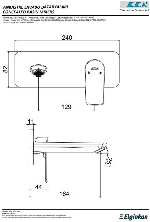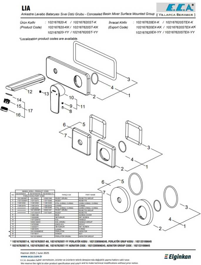 Kireç kırıcılı perlatöre sahiptir Farklı rozet alternatifleri mevcuttur Çıkış ucu uzunluğu 164 mm’dir 3 bar basınçta su akış miktarı dakikada maksimum 6,5 lt 102166601 kodlu sıva altı grubu ayrıca alınmalıdır