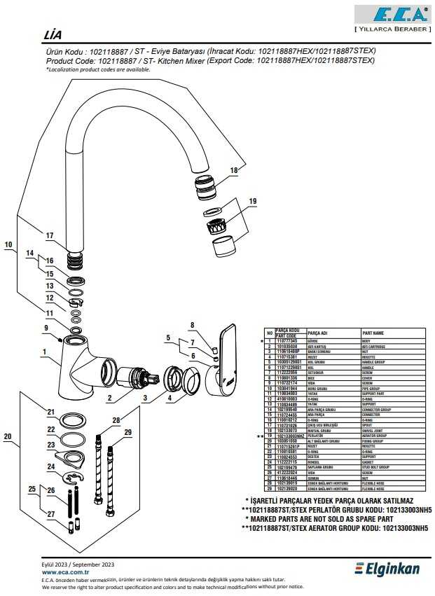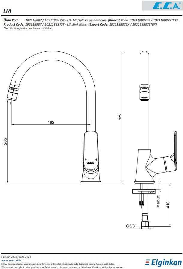 Çıkış ucu uzunluğu 192 mm’dir Çıkış ucu yüksekliği 205 mm’dir Kireç kırıcılı perlatör 3 bar basınçta su akış miktarı dakikada maksimum 6,3 lt