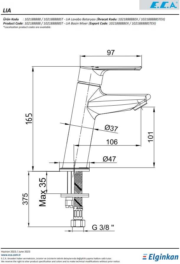 Çıkış ucu uzunluğu 106 mm’dir Çıkış ucu yüksekliği 101 mm’dir Kireç kırıcılı perlatöre sahiptir 3 bar basınçta su akış miktarı dakikada maksimum 7 lt