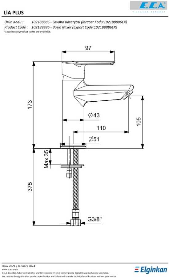 3 bar basınçta su akış miktarı dakikada maksimum 7 l/d- Renk : Krom