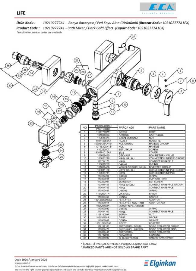 Perlatörün bulunduğu kısmın döndürülmesi ile su akışını duşa veren özel mekanizmalı yön değiştirici- Renk : Altın Boyalı