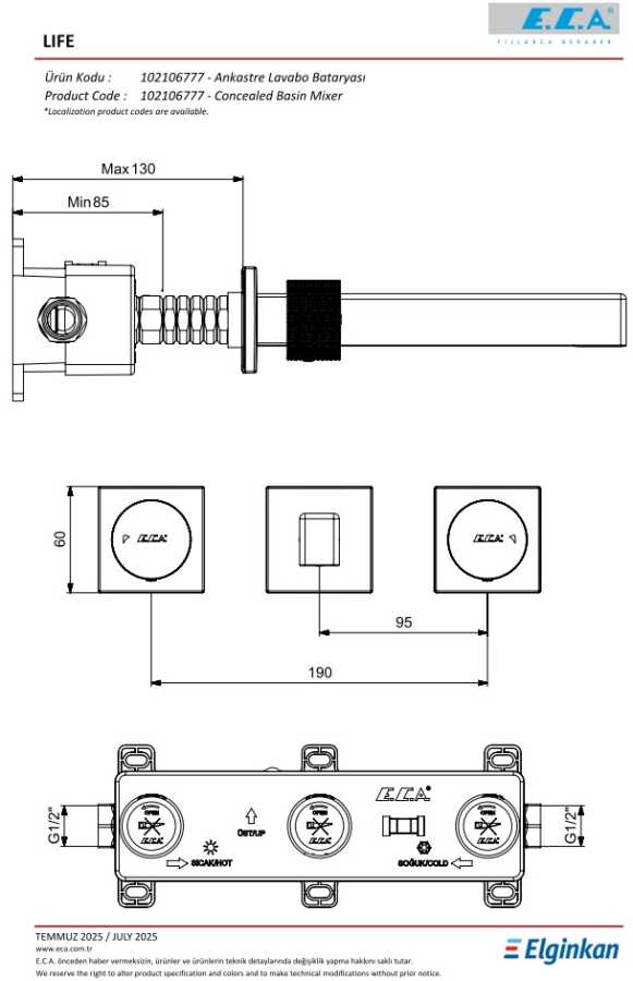Çıkış ucu uzunluğu 200 mm’dir Kireç kırıcılı gizli dikdörtgen perlatöre sahiptir Sıva altı grubu ve sıva üstü grubu birlikte verilmektedir Tesisat bağlantıları G 1/2” 3 bar basınçta su akış miktarı dakikada 9 L