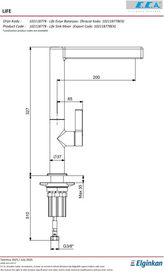 Çıkış ucu uzunluğu 200 mm’dir Çıkış ucu yüksekliği 295 mm’dir Kireç kırıcılı gizli dikdörtgen perlatöre sahiptir 360° döner çıkış uçlu 3 bar basınçta su akış miktarı akikada 7 Lt.