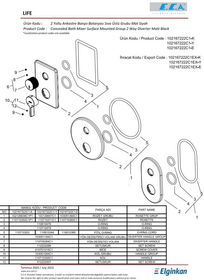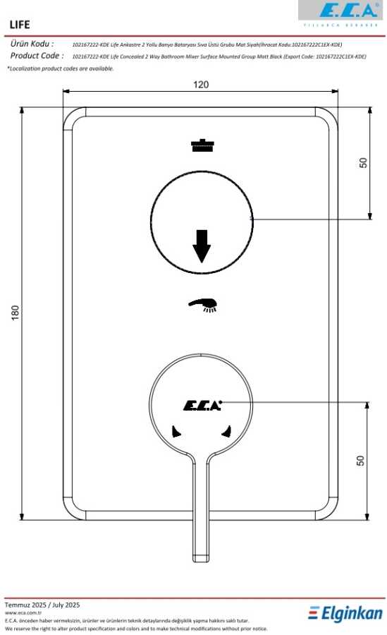 Duş başlığı ve el duşu markalamalı 2 yollu özel yön değiştirici Krom kaplamalı ürünler için 102166207, Mat Siyah kaplamalı ürünler için 102166207C1 kodlu sıva altı ayrıca alınmalıdır.