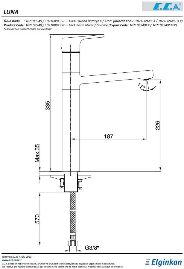 Çıkış ucu yüksekliği 226 mm