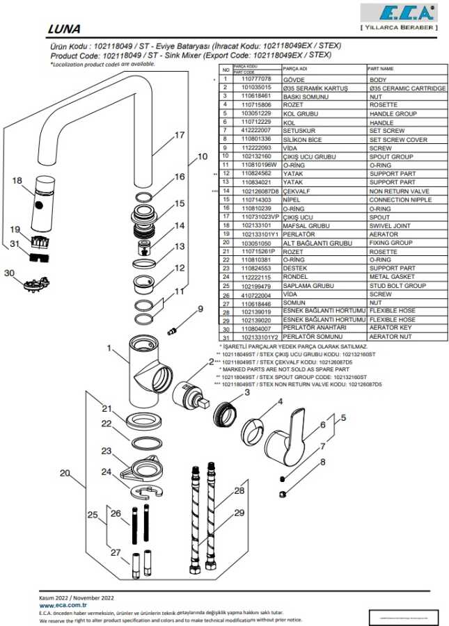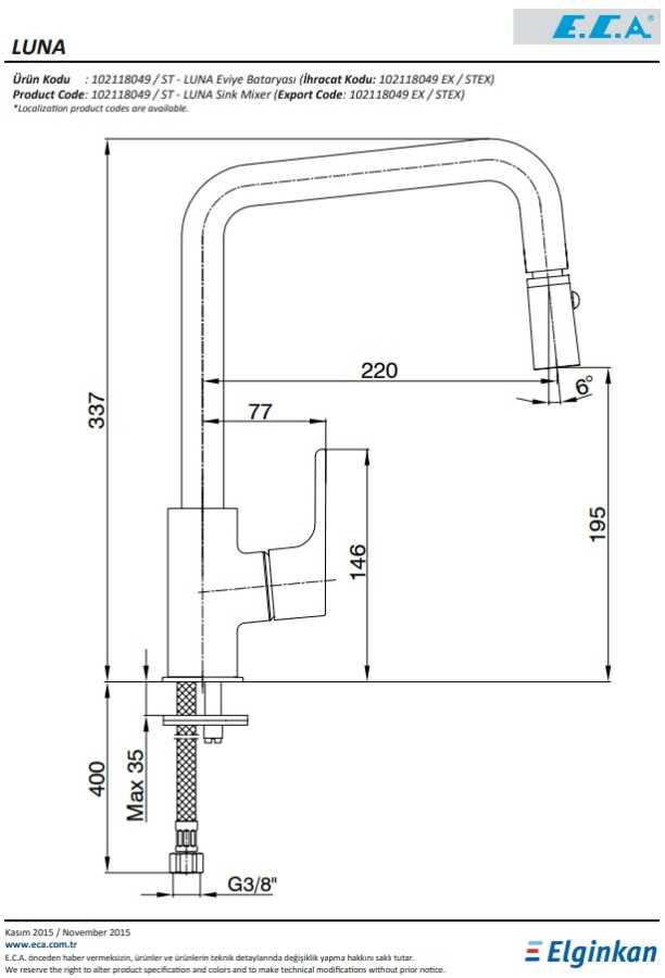 Çıkıs ucu uzunluğu 220 mm’dir Çıkıs ucu yüksekliği 195 mm’dir Çift fonksiyonlu mafsallı el duşu 360° döner çıkış uçlu 3 bar basınçta su akış miktarı dakikada maksimum 7,4 lt