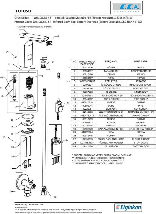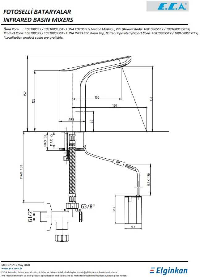 Tek su girişlidir Çıkış ucu uzunluğu 100 mm’dir Çıkış ucu yüksekliği 130 mm’dir 6 V pil ile çalışır Filtreli ara musluk ürünle birlikte verilmektedir Kireç kırıcılı perlatör 3 bar basınçta su akış miktarı dakikada 5 lt Yurtiçi ücretsiz montaj hizmeti verilmektedir