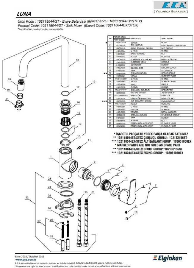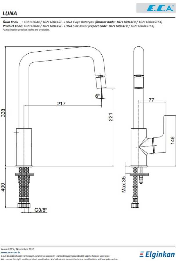 Çıkış ucu uzunluğu 217 mm’dir Çıkış ucu yüksekliği 221 mm’dir Kireç kırıcılı gizli perlatör 360° döner çıkış uçlu Mafsallı 3 bar basınçta su akış miktarı dakikada maksimum 7,8 lt