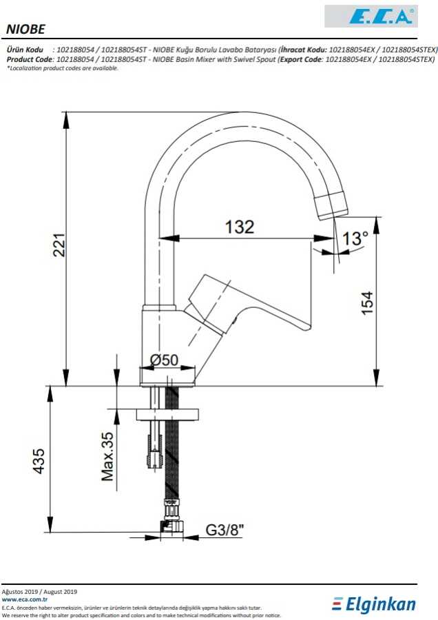 Soğukta açılma özelliği Çıkış ucu uzunluğu 132 mm'dir Çıkış ucu yüksekliği 154 mm'dir Kireç kırıcılı perlatör 360° döner çıkış uçlu 3 bar basınçta su akış miktarı dakikada maksimum 7,2 lt