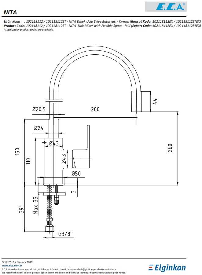 Çıkış ucu uzunluğu ve yüksekliği ayarlanabilir esnek çıkış ucu 360° döner çıkış uçlu 3 bar basınçta su akış miktarı dakikada maksimum 7,4 lt
