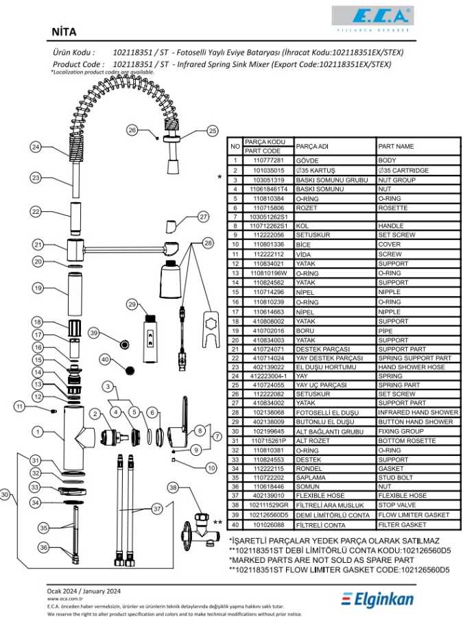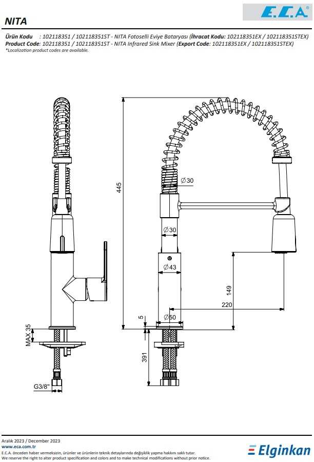 Çıkış ucu uzunluğu 220 mm’dir Çıkış ucu yüksekliği 149 mm’dir Fotoselli el duşu 360° dönebilen yaylı çıkış ucu El duşu üzerinde; uzun süreli su akışı sağlayan yan sensör ve kısa süreli su akışı sağlayan alt sensör bulunmaktadır 3 bar basınçta su akış miktarı dakikada maksimum 7 Lt.
