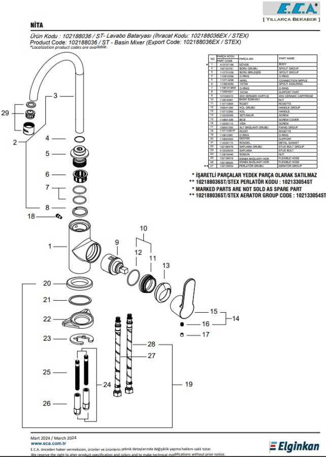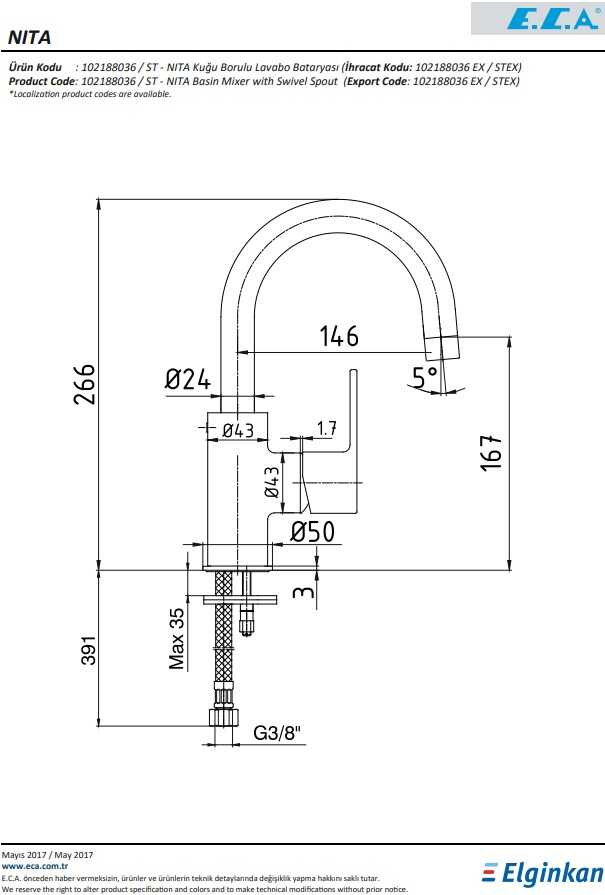 Çıkış ucu uzunluğu 146 mm’dir Çıkış ucu yüksekliği 151 mm’dir Kireç kırıcılı perlatör 360 derece döner çıkış uçlu 3 bar basınçta su akış miktarı dakikada maksimum 7,5 lt