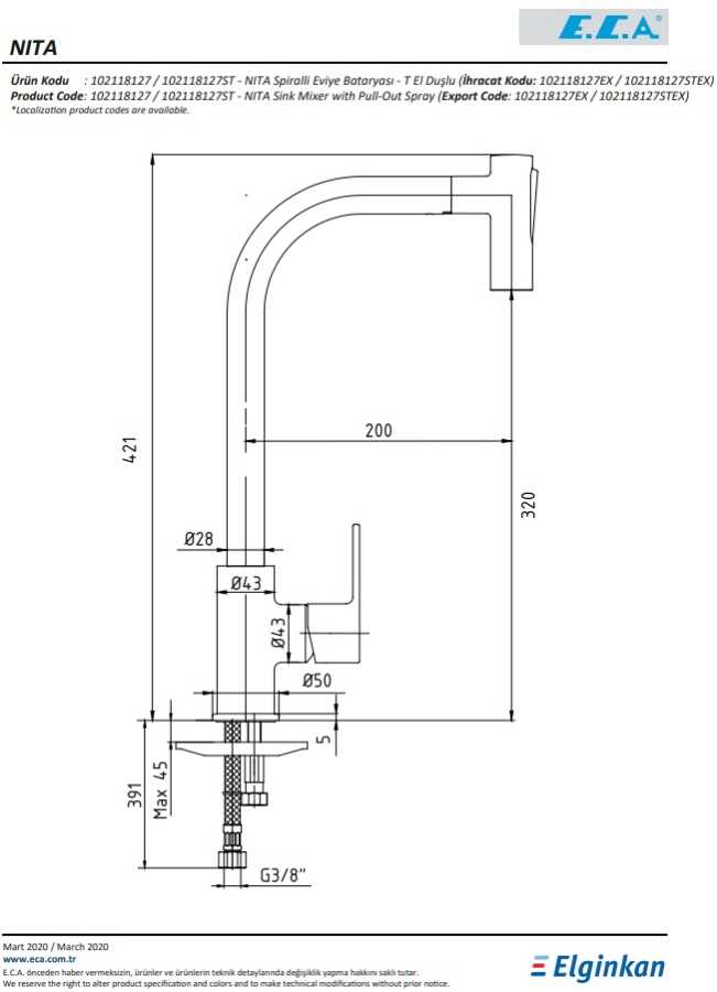 Çıkış ucu uzunluğu 200 mm’dir Çıkış ucu yüksekliği 320 mm’dir 360° döner çıkış uçlu 3 bar basınçta su akış miktarı dakikada maksimum 5,5 lt