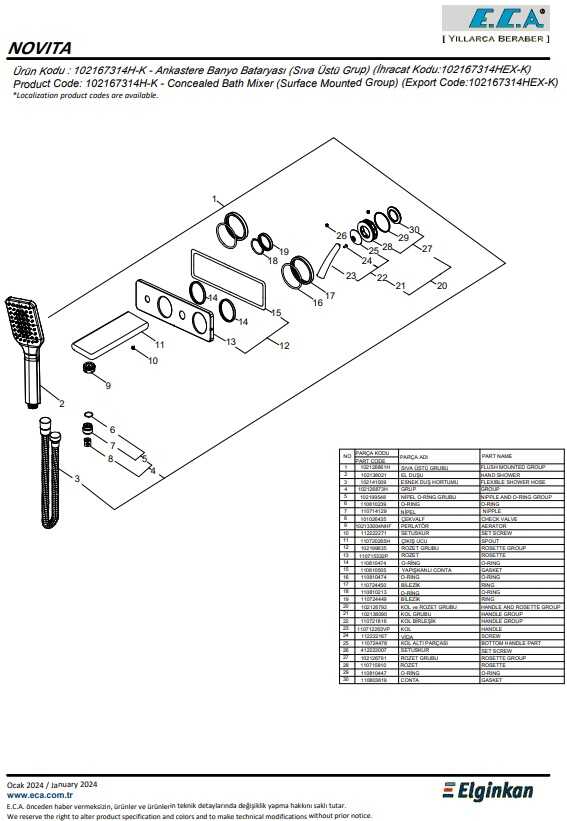 Çıkış ucu uzunluğu 159 mm’dir Joystick kartuş Kireç kırıcılı perlatöre sahiptir Özel el duşu nipeli ve Tiera Plus el duşu ürün ile birlikte verilmektedir Suyu duş başlığına, el duşuna ve çıkış ucuna veren 3 yollu özel yön değiştiriciye sahiptir 102166303H kodlu sıva altı grubu ayrıca alınmalıdır İnovatif E.C.A. Hygiene Plus kaplama