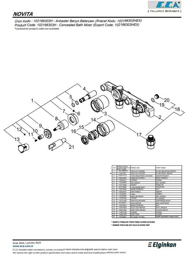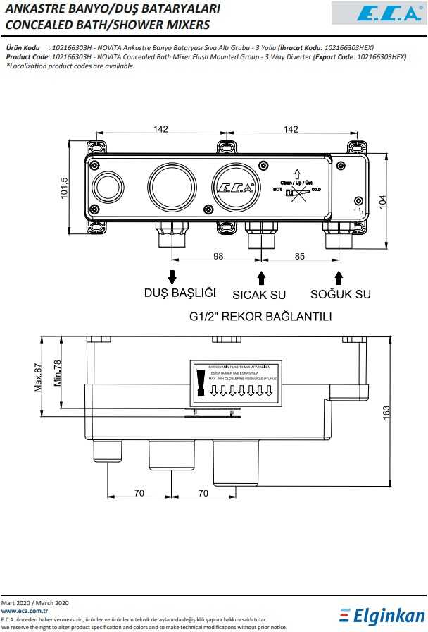Plastik muhafazalı sıva altı gövde Plastik ve galvaniz boruya uygun bağlantı Tesisat bağlantıları G 1/2’’ dir 102167314H-K kodlu sıva üstü grubu ayrıca alınmalıdır 3 yollu özel yön değiştirici El duşu dirseği ve yön değiştirici volanı birlikte verilmektedir İnovatif E.C.A. Hygiene Plus kaplama