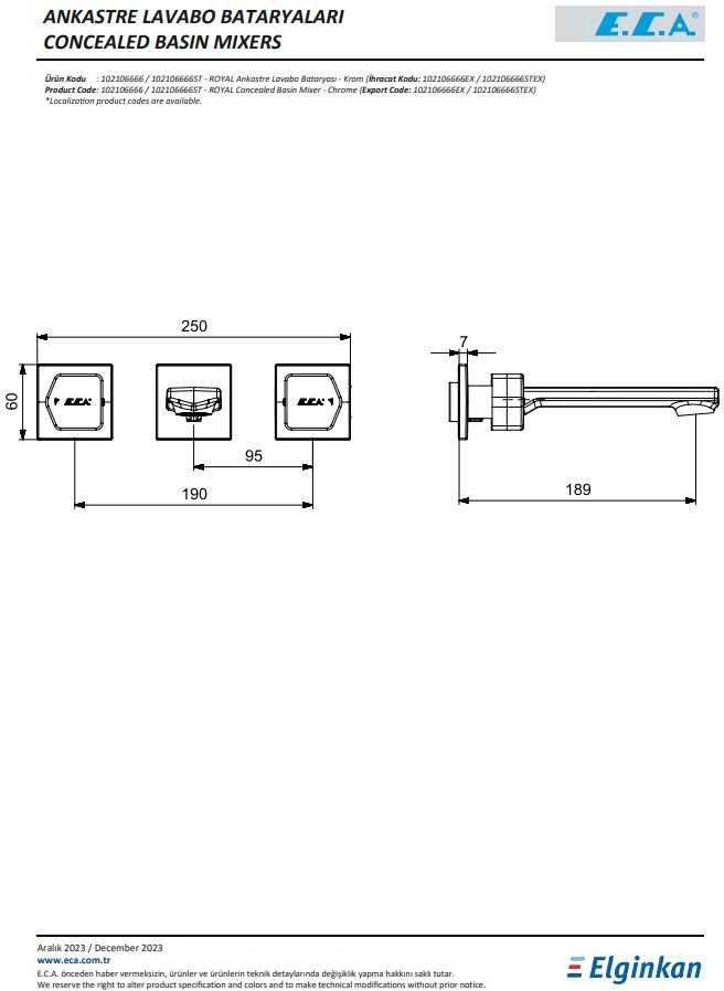 Çıkış ucu uzunluğu 190 mm'dir Kireç kırıcılı gizli perlatöre sahiptir Sıva altı grubu ve sıva üstü grubu birlikte verilmektedir Plastik muhafazalı sıva altı gövde Plastik ve galvaniz boruya uygun bağlantı Mermer ve granit duvar kaplamasına uygun 37 mm ayar imkanı Tesisat bağlantıları G 1/2"