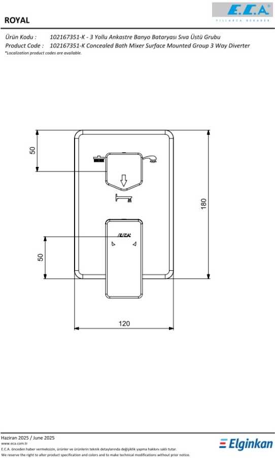 Duş başlığı, el duşu ve çıkış ucu markalamalı 3 yollu özel yön değiştirici Köşeli, yuvarlak ve elips olmak üzere 3 tip rozet alternatifi mevcuttur 102166307 kodlu sıva altı grubu ayrıca alınmalıdır