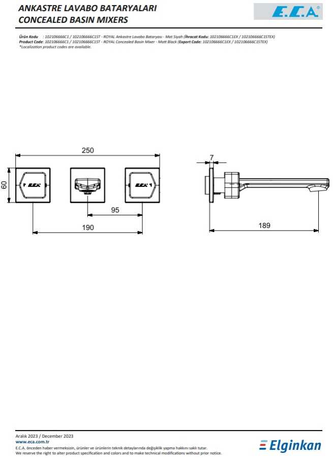 Çıkış ucu uzunluğu 190 mm'dir Kireç kırıcılı gizli perlatöre sahiptir Sıva altı grubu ve sıva üstü grubu birlikte verilmektedir Plastik muhafazalı sıva altı gövde Plastik ve galvaniz boruya uygun bağlantı Mermer ve granit duvar kaplamasına uygun 37 mm ayar imkanı Tesisat bağlantıları G 1/2"