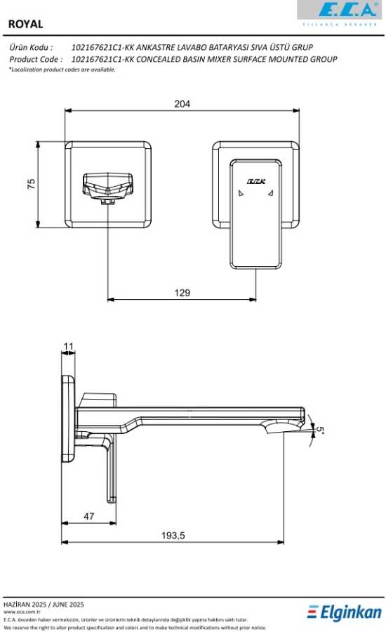Farklı rozet alternatifleri mevcuttur Kireç kırıcılı gizli perlatöre sahiptir Çıkış ucu uzunluğu 190 mm’dir 3 bar basınçta su akış miktarı dakikada maksimum 6,5 lt'dir 102166601C1 kodlu sıva altı grubu ayrıca alınmalıdır