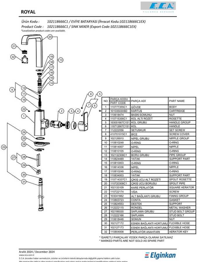 Çıkış ucu uzunluğu 197 mm'dir Çıkış ucu yüksekliği 287 mm'dir Kireç kırıcılı gizli dikdörtgen perlatöre sahiptir 360° döner çıkış uçlu 3 bar basınçta su akış miktarı dakikada maksimum 6,5 lt
