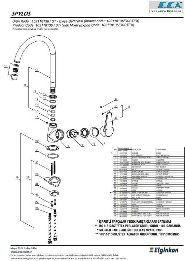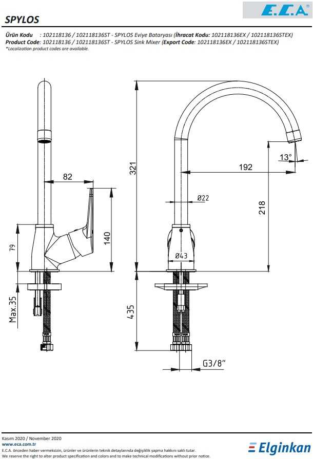 Çıkış ucu uzunluğu 192 mm'dir Çıkış ucu yüksekliği 218 mm'dir Kireç kırıcılı perlatör 360° döner çıkış uçlu 3 bar basınçta su akış miktarı dakikada maksimum 7 lt