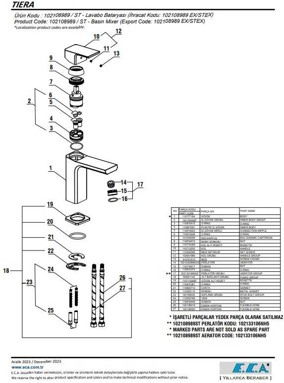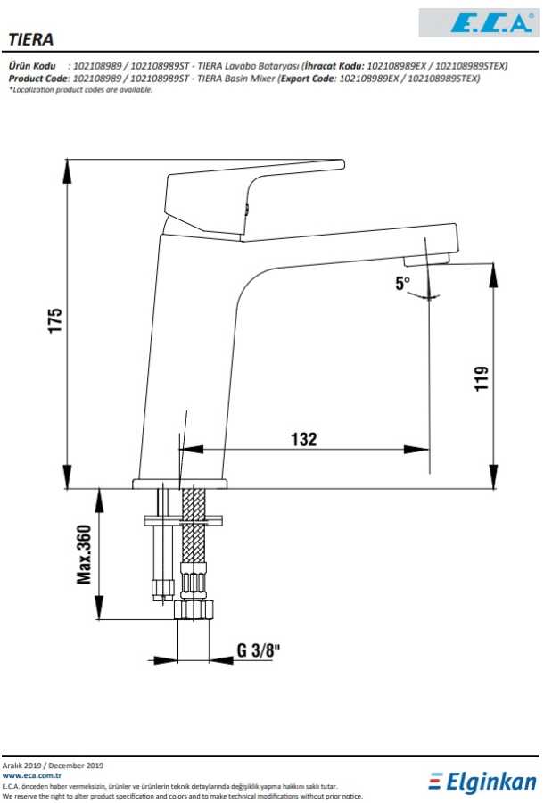 Çıkış ucu uzunluğu 132 mm'dir Çıkış ucu yüksekliği 119 mm'dir Kireç kırıcılı perlatör 3 bar basınçta su akış miktarı dakikada maksimum 7,8 lt