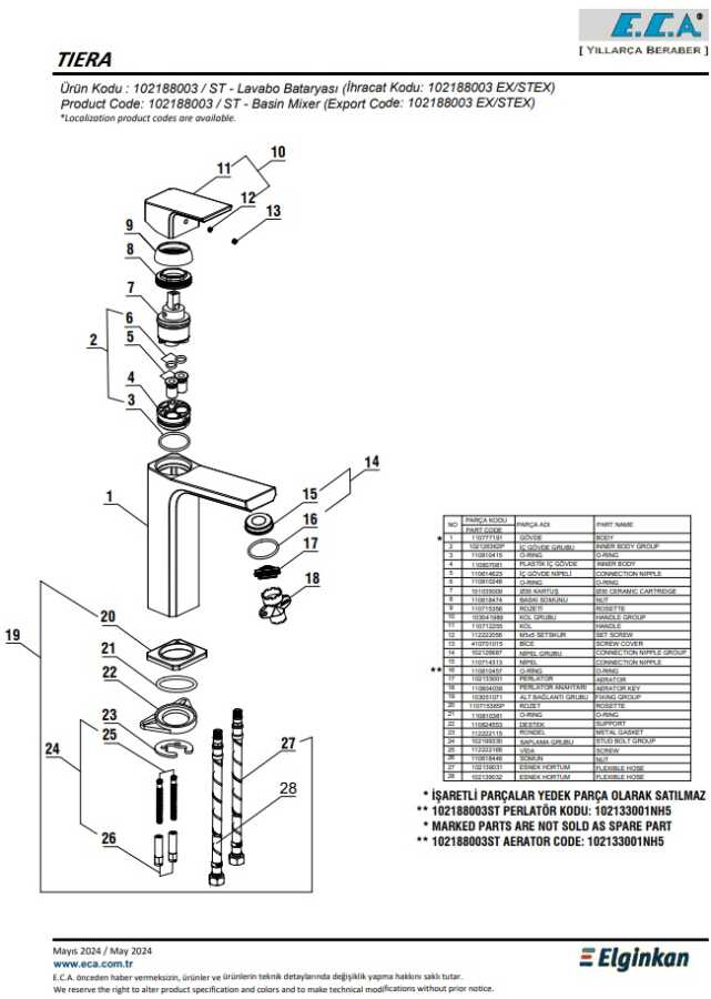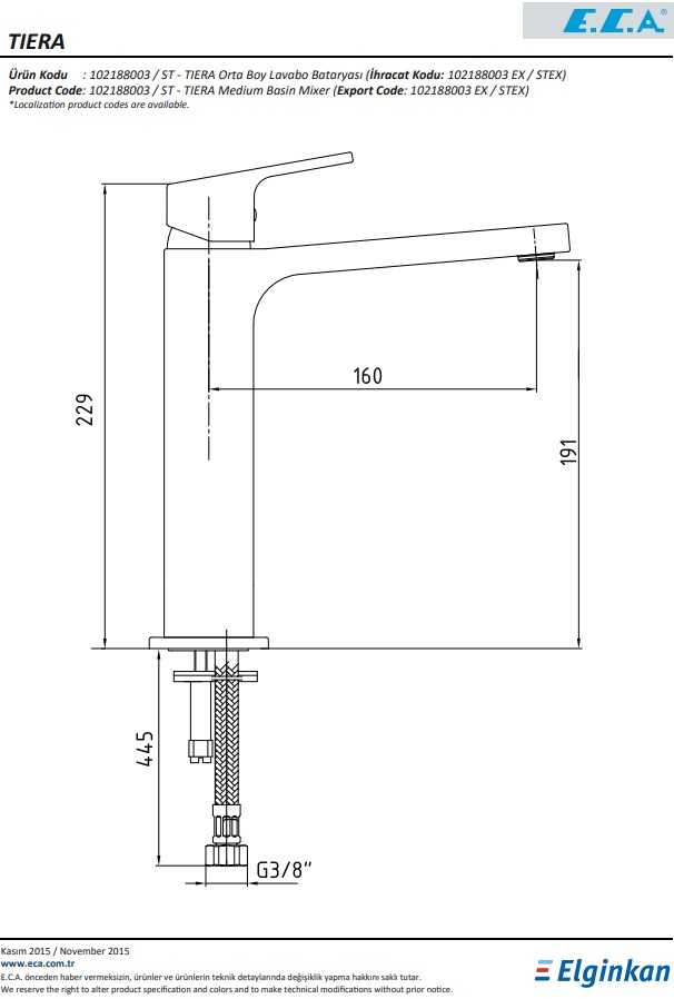 Çıkış ucu uzunluğu 160 mm'dir Çıkış ucu yüksekliği 191 mm'dir Kireç kırıcılı gizli perlatör 3 bar basınçta su akış miktarı dakikada maksimum 6,6 lt