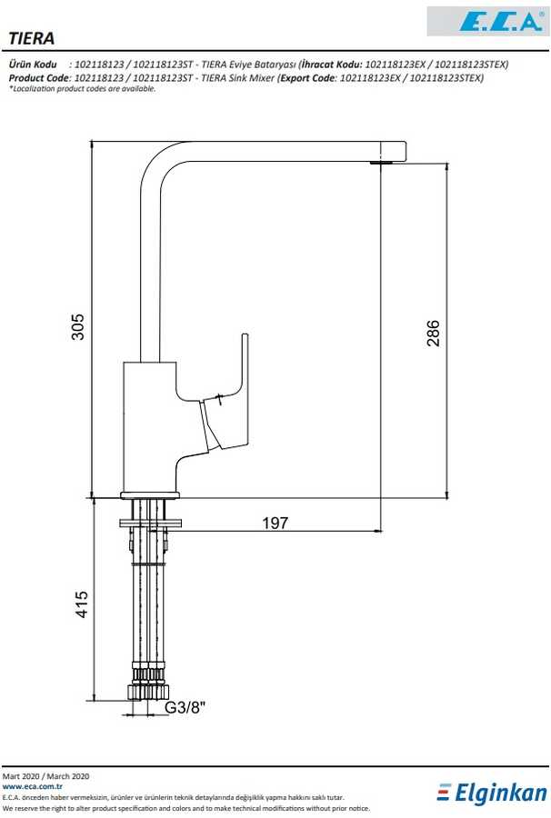 Çıkış ucu uzunluğu 197 mm’dir Çıkış ucu yüksekliği 286 mm’dir Kireç kırıcılı gizli perlatöre sahiptir 360° döner çıkış uçlu 3 bar basınçta su akış miktarı dakikada maksimum 6,5 lt